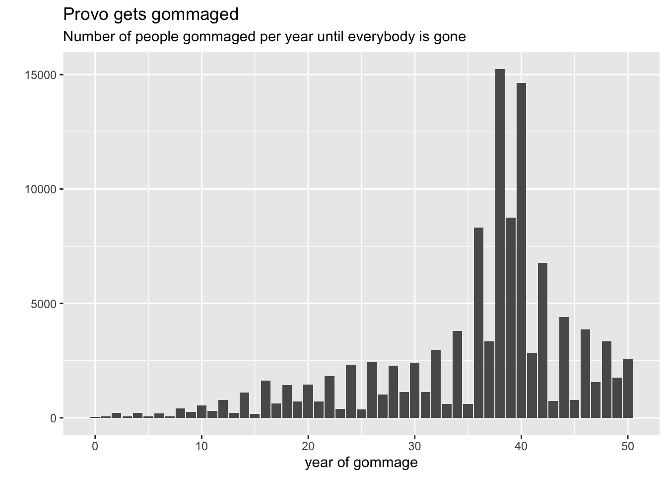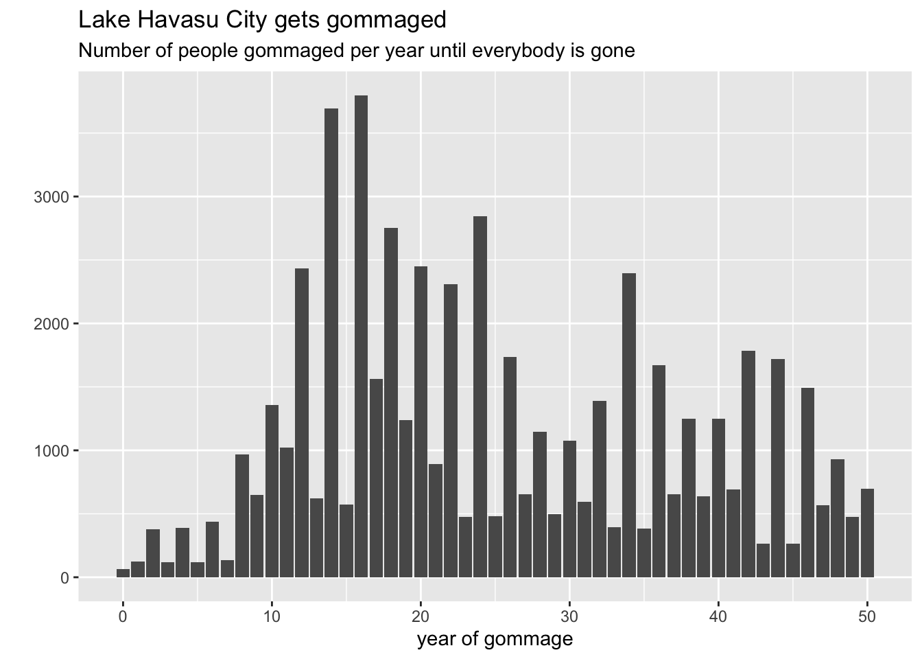 subtitle = "Number of people gommaged per year until everybody is gone")